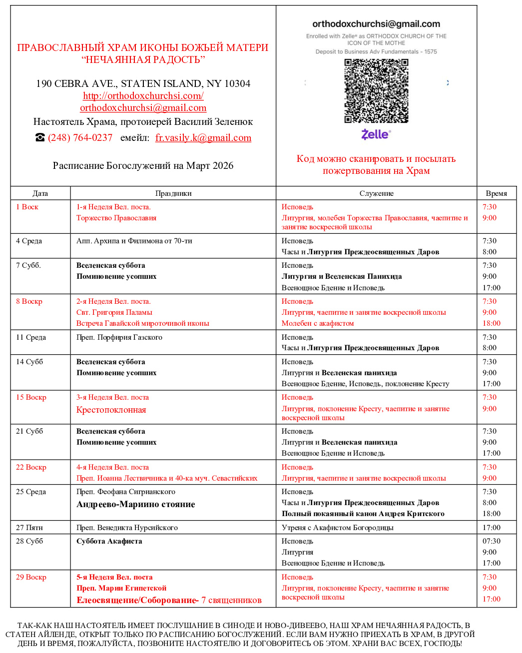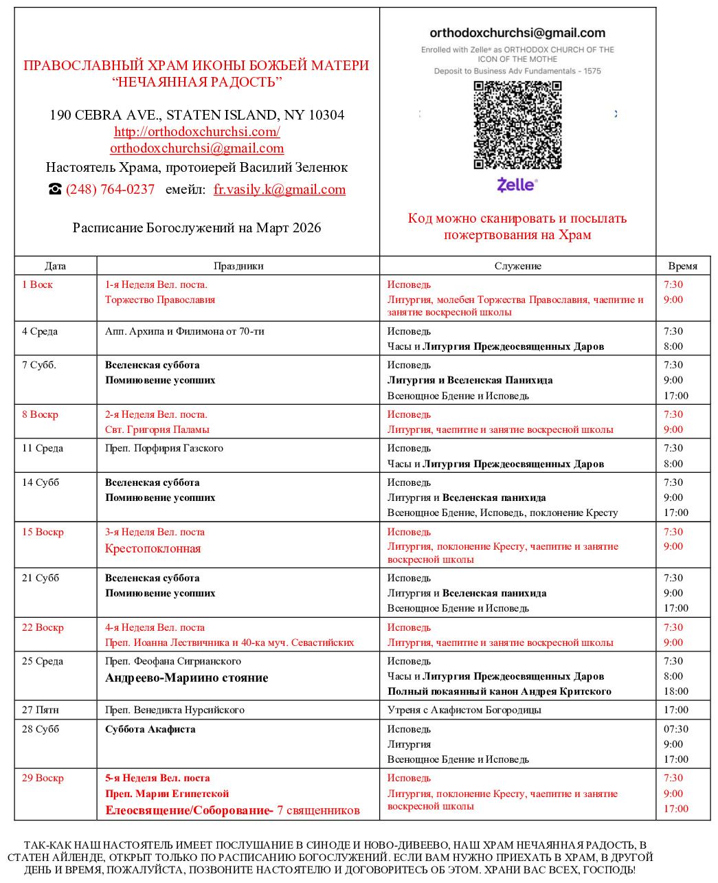 Расписания богослужений на март. Нажмите на изображение, чтобы увеличить или распечатать.